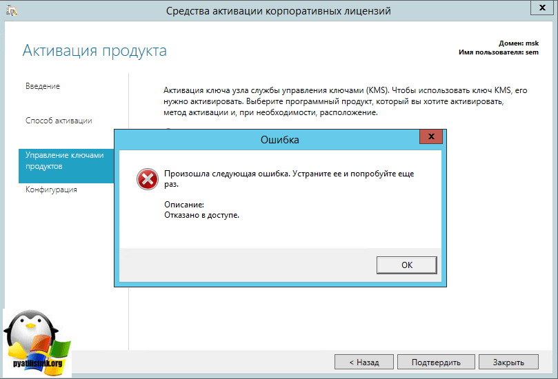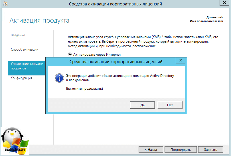 Обратите внимание, что нужно быть администратором предприятия для настройки Active Directory Based Activation