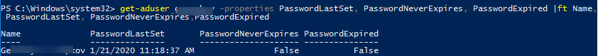 С помощью командлета Get-AdUser можно получить время последней смены пароля пользователя и проверить, установлена ли опция бессрочного пароля (PasswordNeverExpires):