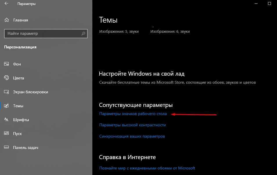 В блоке «Сопутствующие параметры» выберите «Параметры значков рабочего стола».