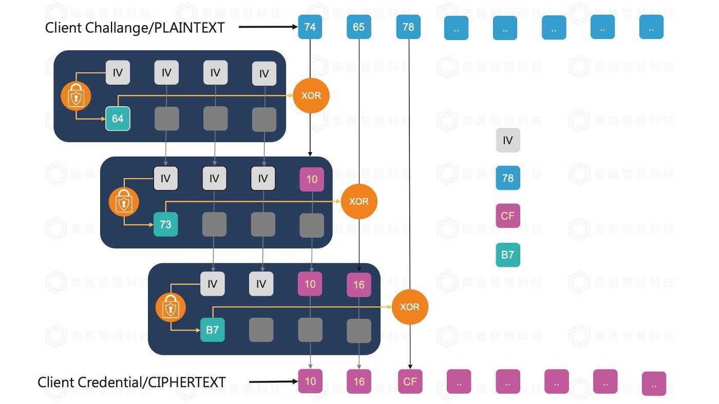 下圖以 Jarvis 在 modernnetsec 上介紹的內容 為例。首先,IV 的第一個 Byte 會經過 AES_op 算出 64,64 再和明文第一個 Byte 74 做 XOR 得出密文的第一個 Byte 10。於此同時,新產生的密文 10 會變成 IV 的最後一個 Byte,並 Rotate 掉原先 IV 的第一個 Byte。