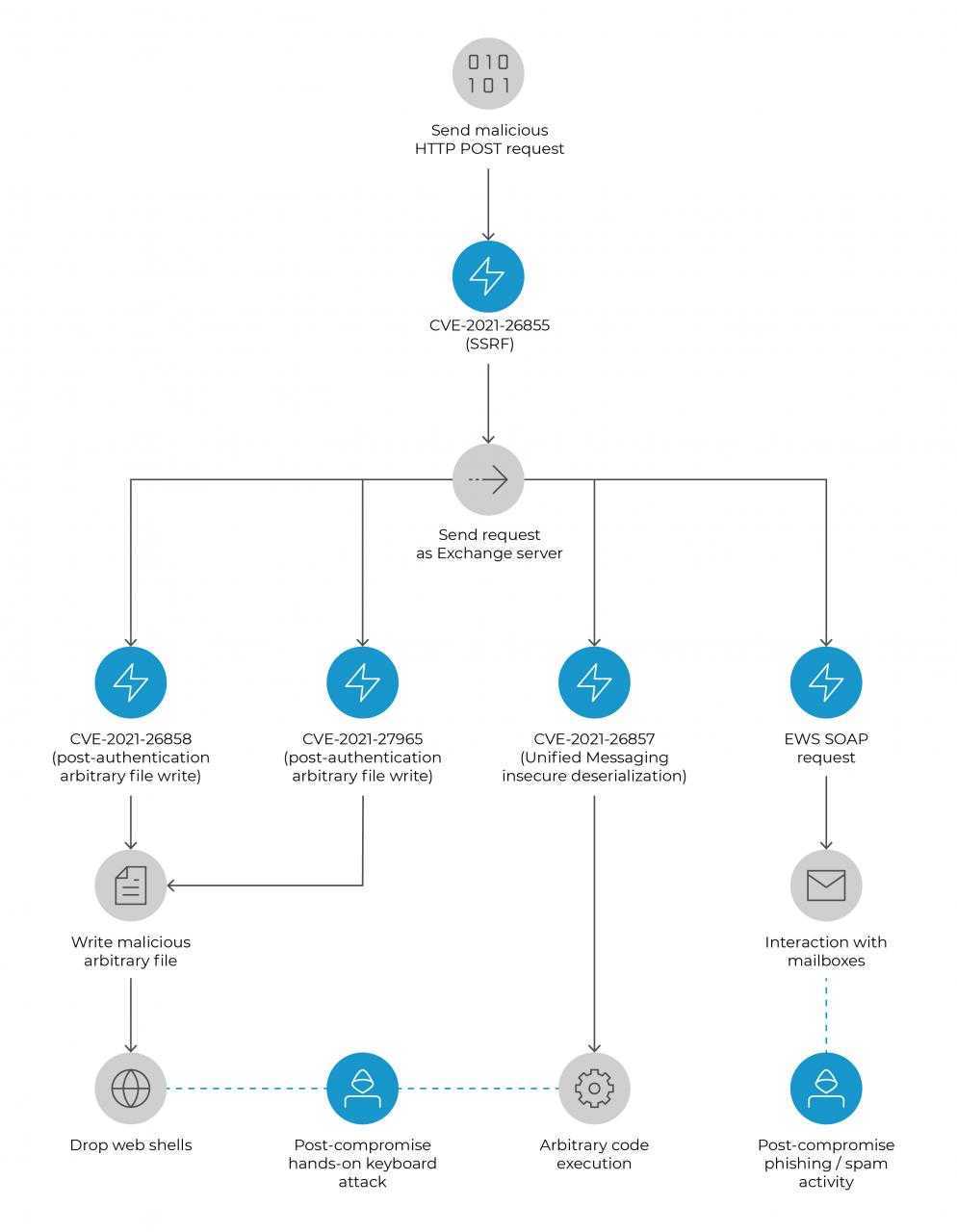 Например, злоумышленник, использующий ProxyLogon, может выдать себя за администратора и пройти аутентификацию в панели управления Exchange (ECP), а затем перезаписать любой файл в системе с уязвимостями CVE-2021-26858 или CVE-2021-27065.