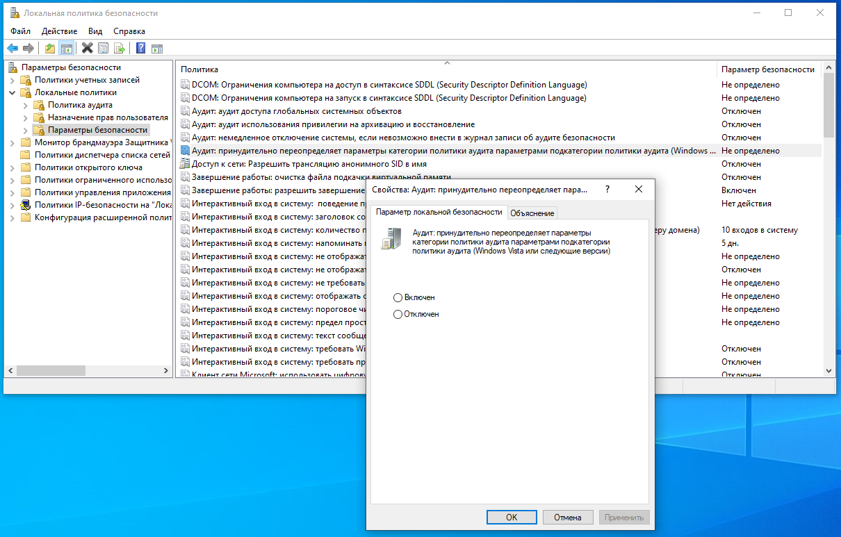 Обратите внимание, что для использования параметров «Конфигурация расширенной политики аудита» также необходимо в Локальной политике безопасности (secpol.msc) включить по пути Параметры безопасности → Локальные политики → Параметры безопасности параметр «Аудит: принудительно переопределяет параметры категории политики аудита параметрами подкатегории политики аудита (Windows Vista или следующие версии)». Это значение по умолчанию установлено на «Включён», поэтому если вы не отключали эту политику, то вам не нужно о ней беспокоиться.