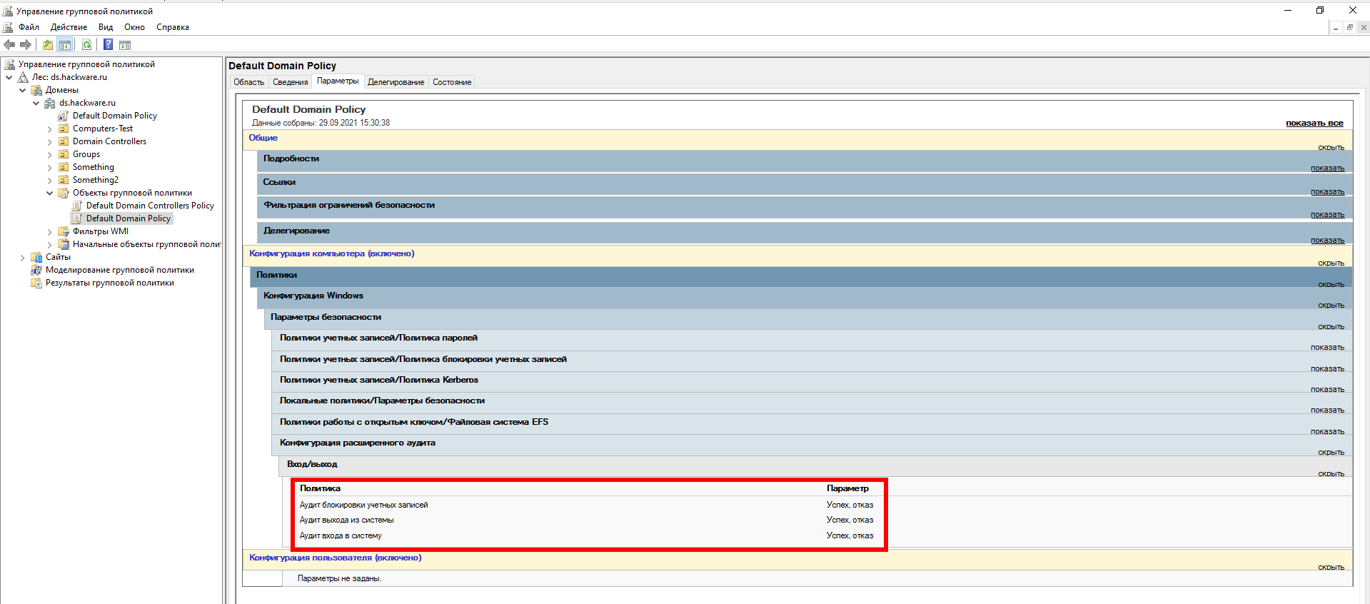 - Параметры политики домена