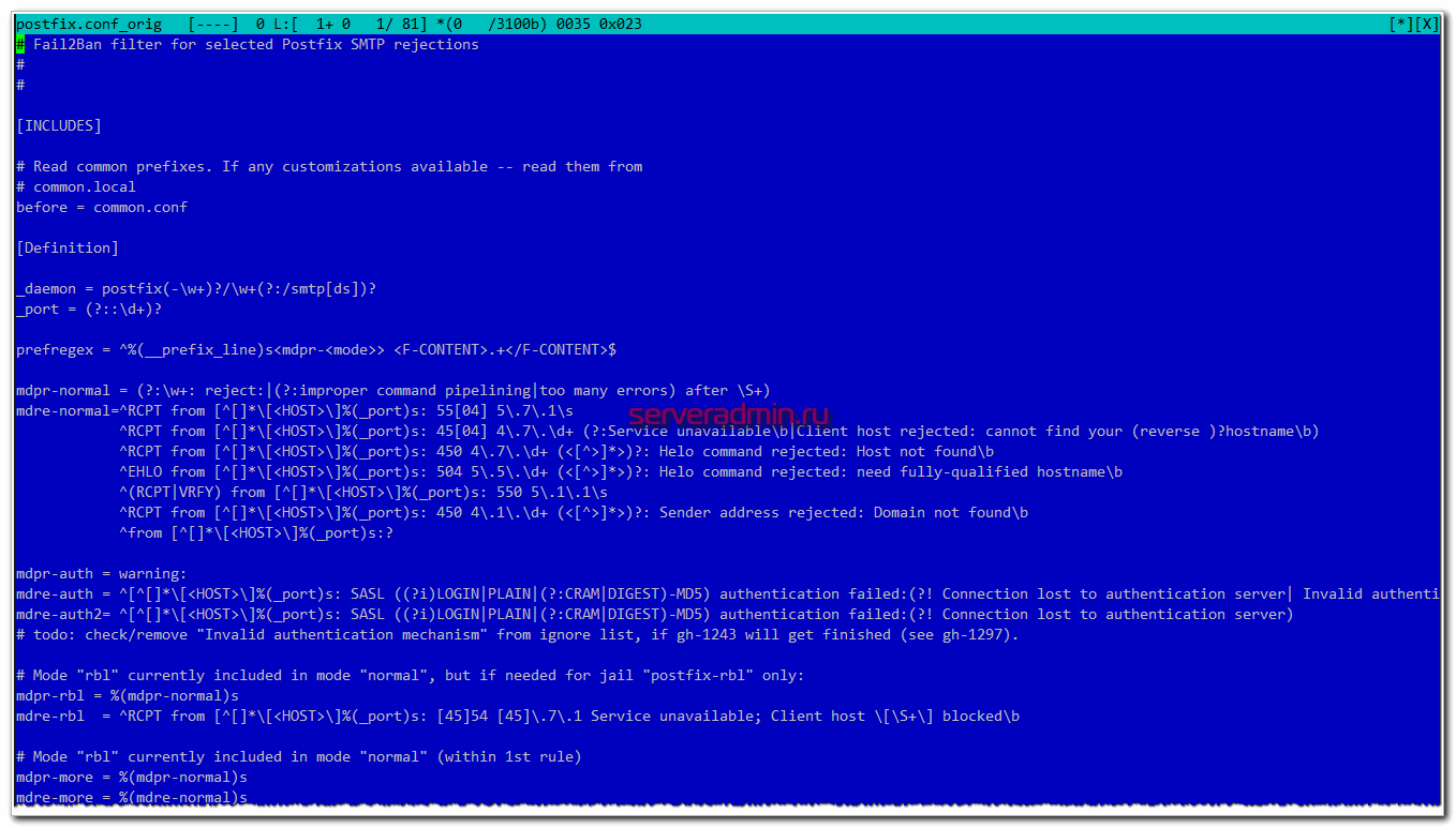 Его придумал не я. Честно подсмотрел на просторах интернета. Примеров масса и у нас, и в англоязычном гугле. Далее создаем конфигурационный файл с фильтром из этого regexp — /etc/fail2ban/filter.d/postfix-sasl.conf.