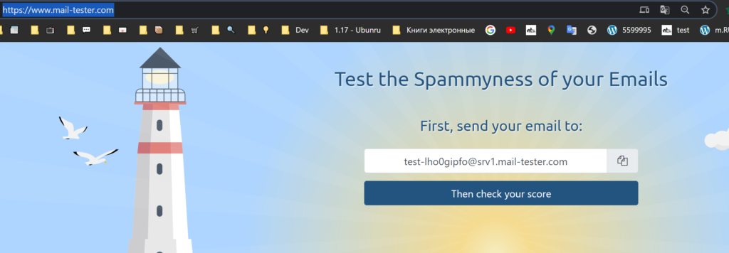 Копируем адрес почты, который нам выдали. Каждый раз он генерируется новый. В примере — test-lho0gipfo@srv1.mail-tester.com, отправляем туда письмо со своего почтового ящика.