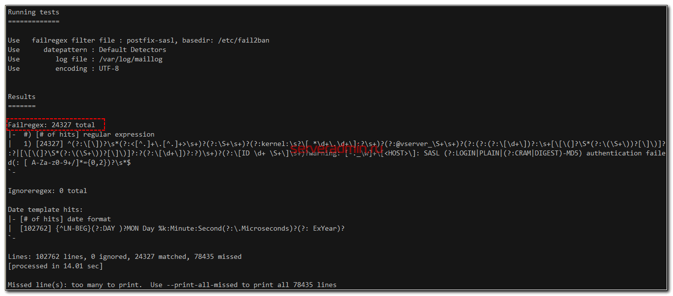 # fail2ban-regex /var/log/maillog /etc/fail2ban/filter.d/postfix-sasl.conf