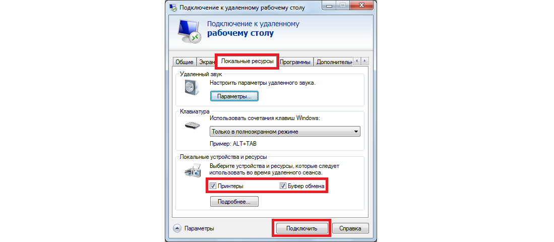 Важно, чтобы вы имели возможность работать не только с папками и файлами, а еще и с устройствами, подключенными к компьютеру, над которым будет осуществляться управление. Поэтому в выпавшем окне перейдите на вкладку «Локальные ресурсы»