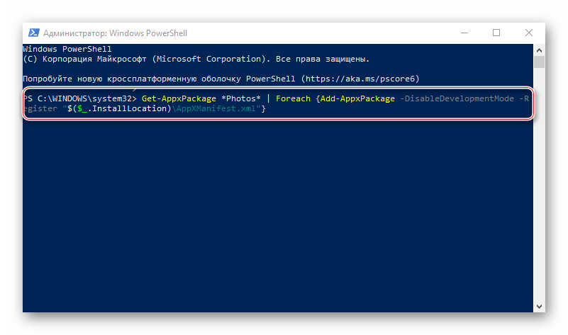 Еще одним из возможных способов решения проблемы – переустановить приложение «Фотографии». Windows 10 предлагает для этого удобную консоль PowerShell, которая пришла на смену стандартной командной строки.
