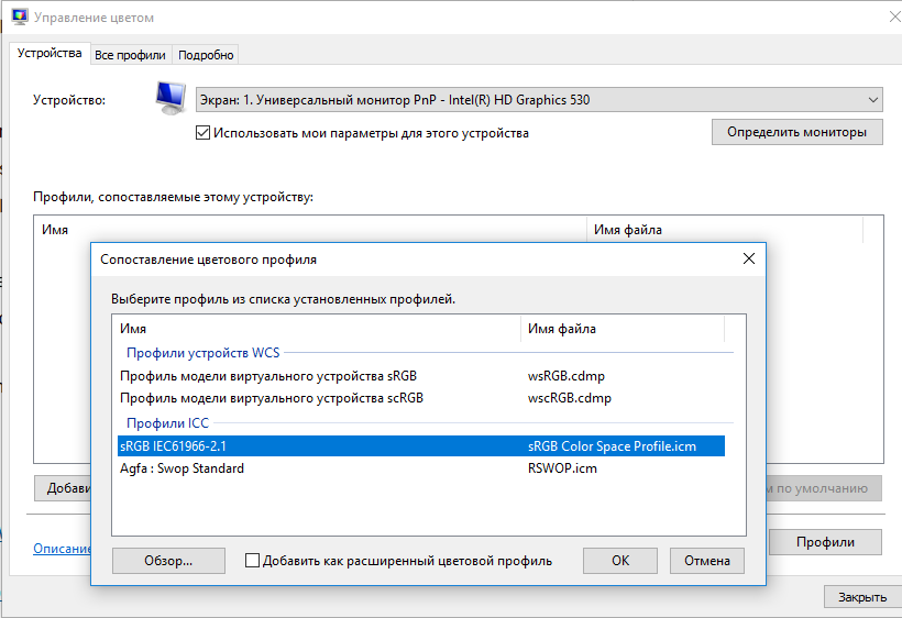 - Нажмите кнопку Добавить, добавьте профиль из списка «Профили ICC” (например sRGB IEC61966-2.1) и нажмите OK;
