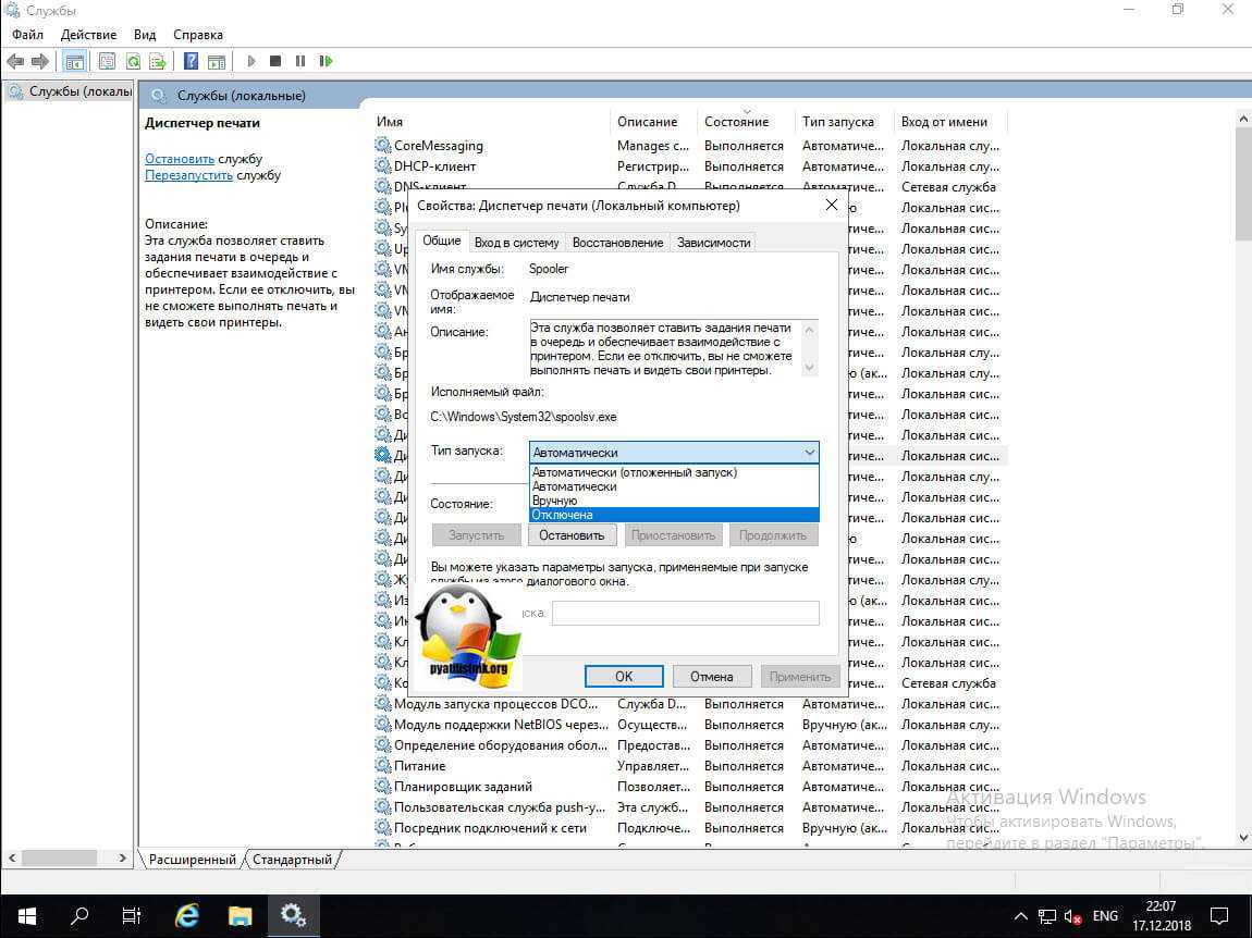 У вас откроется оснастке «Службы» в которой вам нужно пробежаться глазами и выявить те, которые в состоянии «Выполняется», прочитать их описание и отключить. В моем примере, я точно знаю, что на этом сервере печати не будет, поэтому я выключаю службу «Диспетчер печати», через свойства.