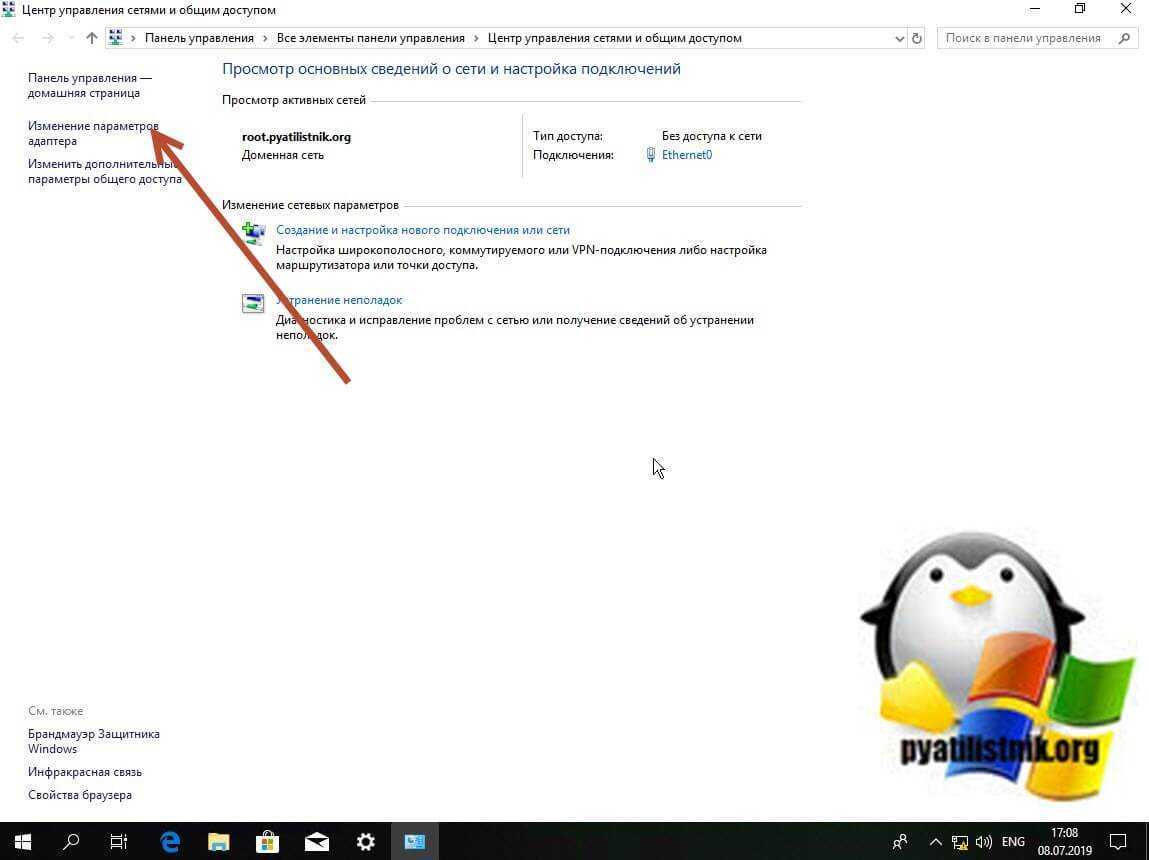 То вас перекинет уже в нужную оснастку, где вам необходимо будет нажать «Изменение параметров адаптера».