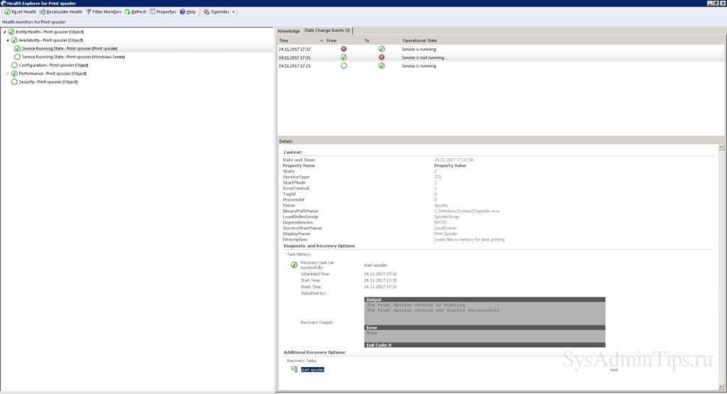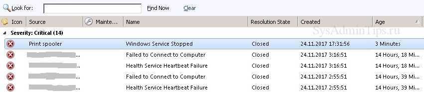 В консоли SCOM в окне Windows Service State статус службы Print Spooler для выбранного сервера должен стать красным.