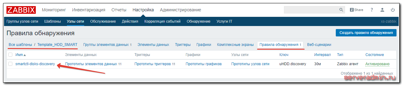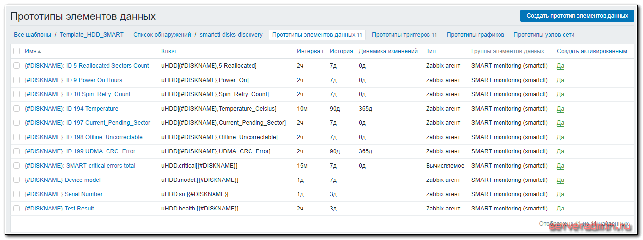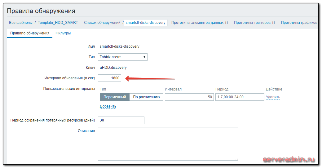 Интервал обновления правил автообнаружения в шаблоне 30 минут, поэтому придется подождать примерно пол часа, прежде чем какие-то новые данные по мониторингу смарта появятся на сервере. Во время отладки можете изменить этот параметр вручную в шаблоне.