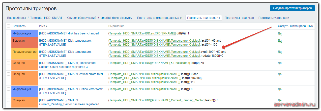 Может быть вам будет полезно чаще, чем раз в 10 минут мониторить температуру жесткого диска. В соседнем разделе посмотрите прототипы триггеров. Некоторые из них вычисляемые и начнут работать только после того, как накопится определенное количество данных. До этого они будут показывать ошибки, имейте это ввиду.