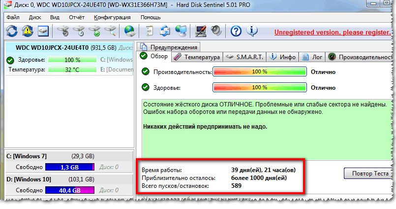Чтобы не быть голословным, покажу сразу же главное окно программы, которое появляется после первого запуска (анализ диска будет сделан сразу автоматически). Здоровье и производительность диска оцениваются как 100% (в идеале, так и должно быть), время, которое диск еще проработает в нормальном режиме оценивается программой примерно в 1000 дней (