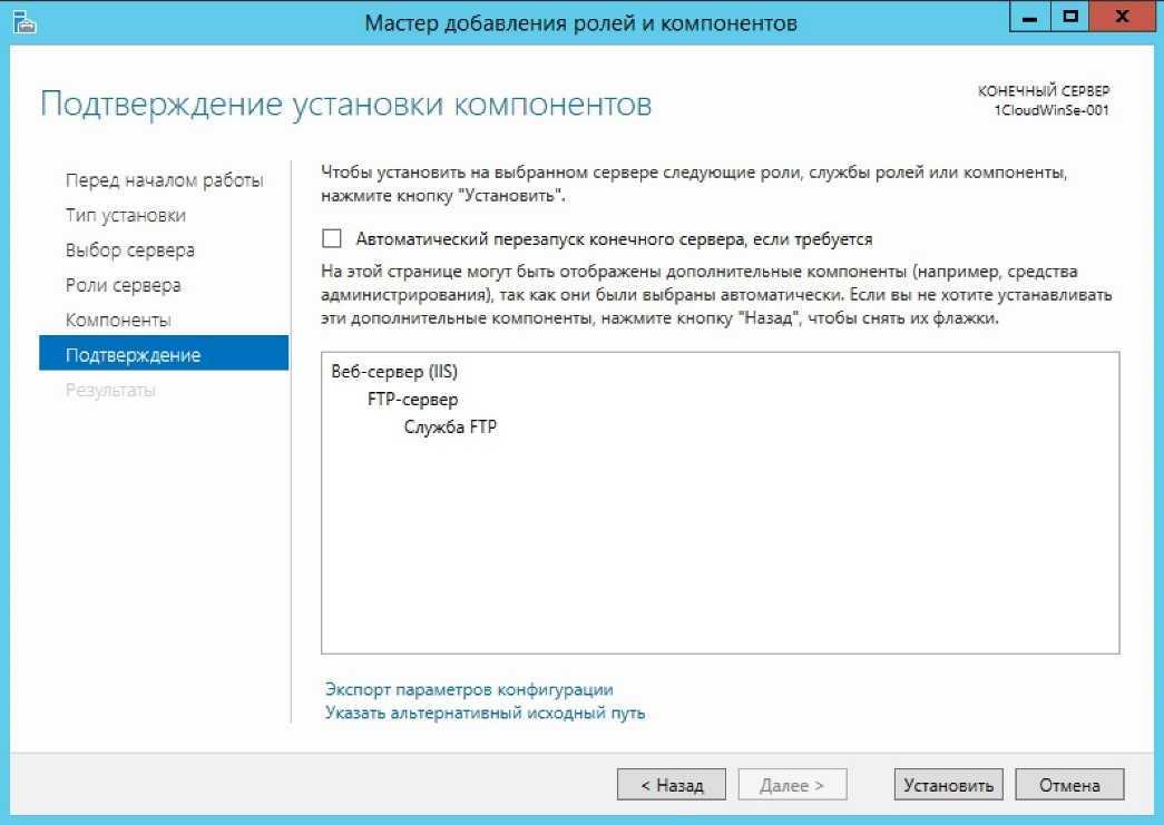 Проверяем компоненты для установки. При первой установке, рекомендуем установить галку в поле Автоматический перезапуск конечного сервера, если потребуется. Кликаем Установить
