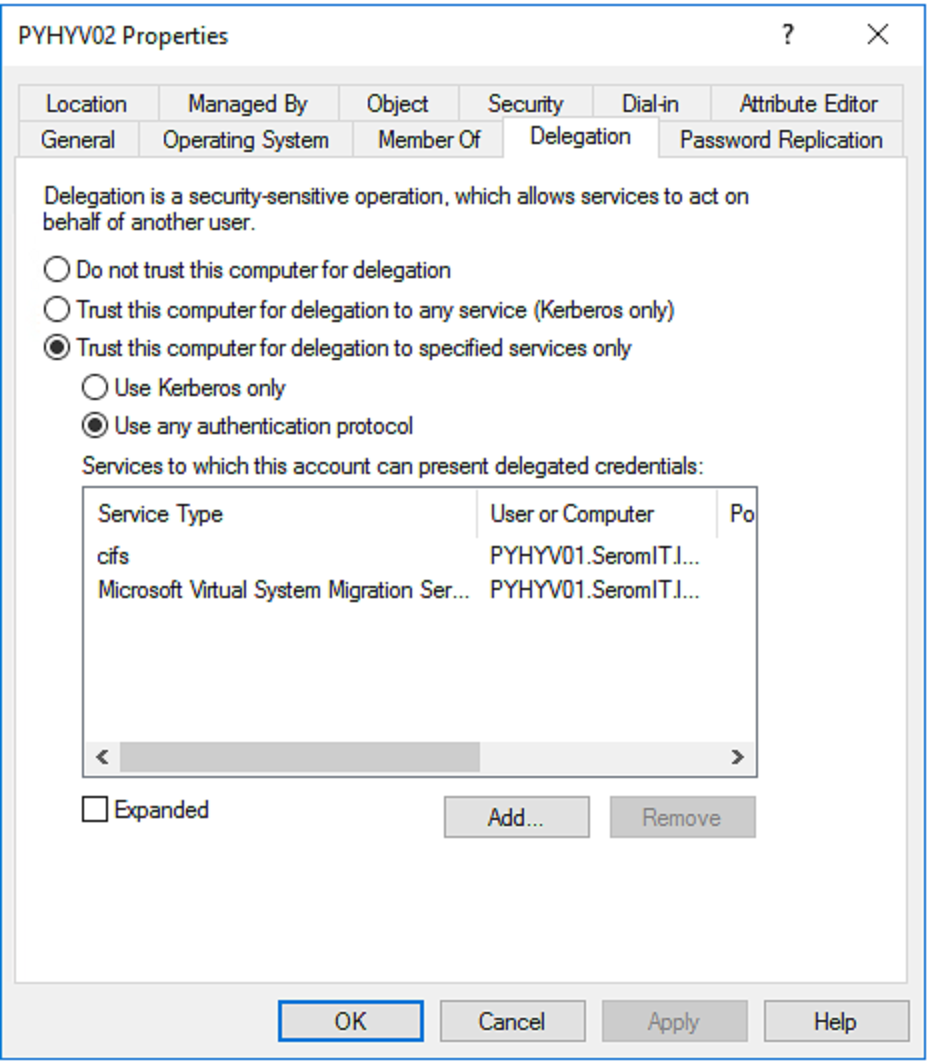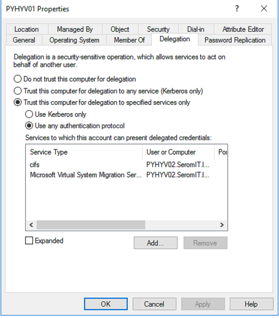 Get-ADComputer $Node | Set-ADObject -Add @{«msDS-AllowedToDelegateTo»=»Microsoft Virtual System Migration Service/$($VMHost).$($DomainName)», «cifs/$($VMHost).$DomainName»,»Microsoft Virtual System Migration Service/$($VMHost)»,»cifs/$($VMHost)»}