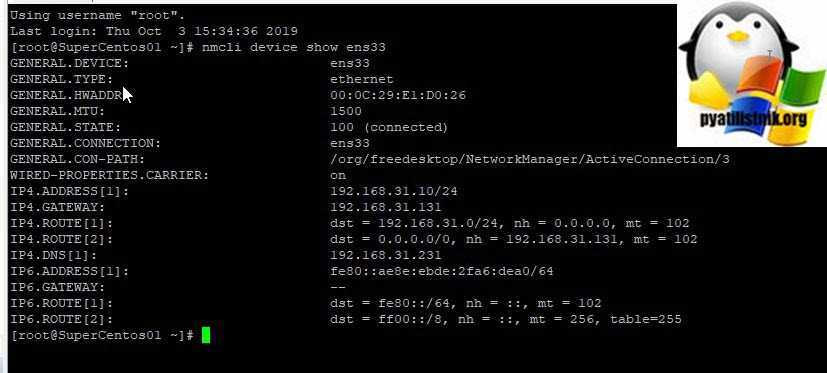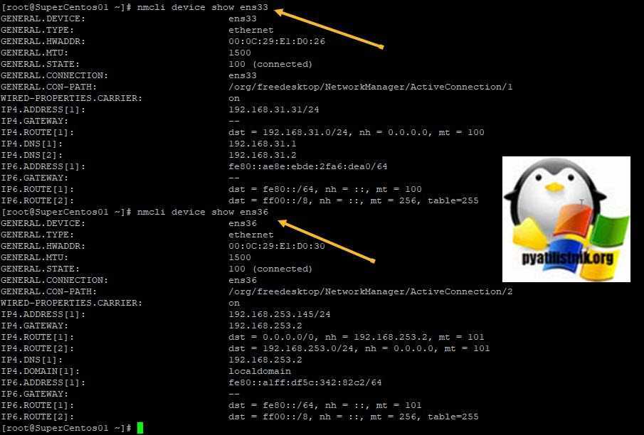 nmcli — это интерфейс командной строки NetworkManager, он идет по умолчанию в CentOS 8, это новое и более удобное средство по настройке сети в centOS 8. Как я показывал выше вы можете посмотреть список ваших интерфейсов командой ip addr show, у меня это ens33 и ens36. Чтобы получить более подробную информацию о сетевом интерфейсе ens33, вы можете выполнить следующую команду: