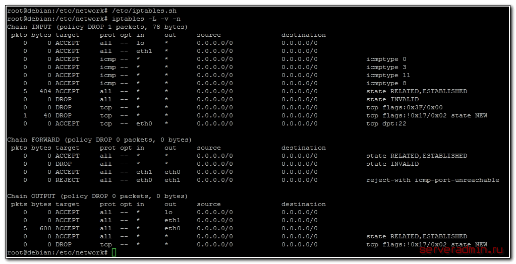 Я приведу здесь сразу готовый вариант файла с правилами iptables, необходимых для работы интернет шлюза в debian. В файле даны подробные комментарии ко всем значениям, так что вы без проблем разберетесь и закомментируете или наоборот раскомментируете необходимые вам значения. Качаем скрипт правил iptables — iptables-debian.sh