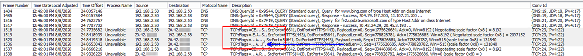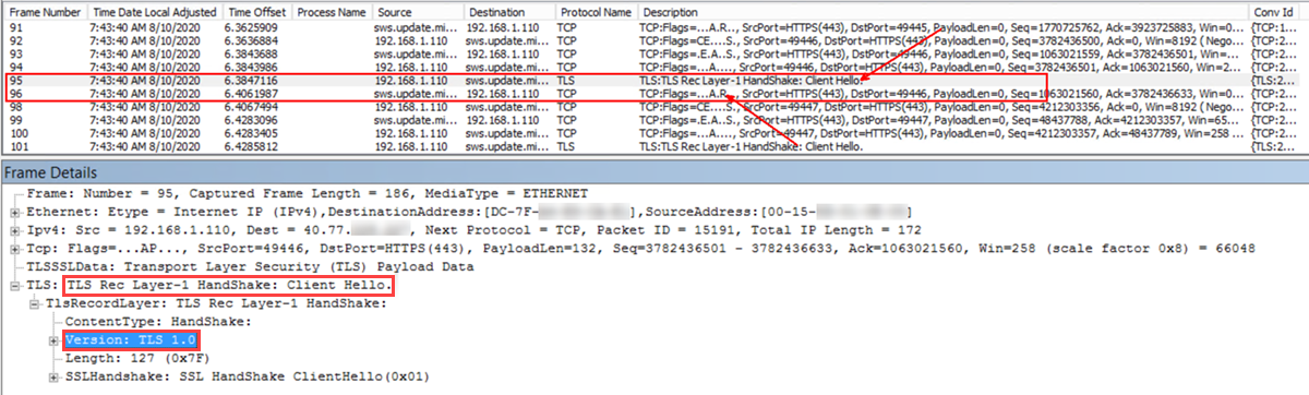 В сетевом захвате кадр 95 — это пакет Client Hello, использующий TLS 1.0. Frame 96 — это пакет RST от https://sws.update.microsoft.com . Так как конечная точка поддерживает только подключения TLS 1.2, она отказано в подключении, а затем выдает ответ сброса. Сервер WSUS будет пытаться несколько раз, прежде чем он сдается. Поэтому эта последовательность повторяется.