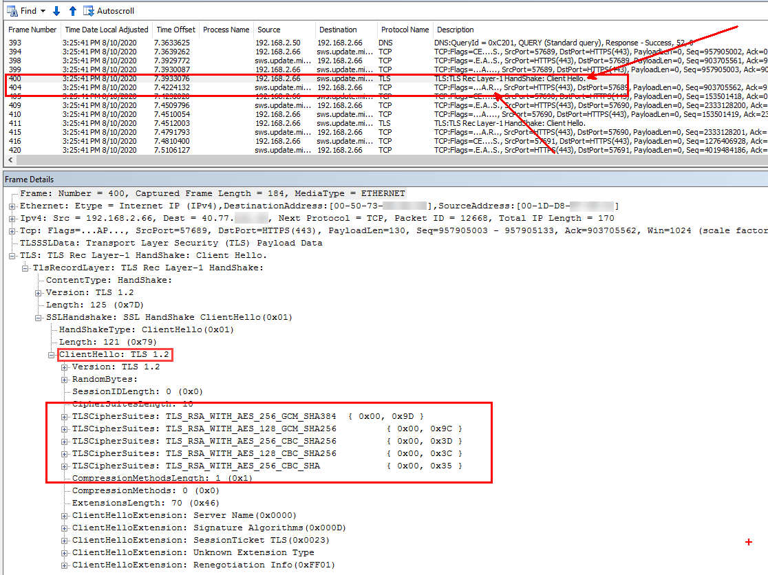 В сетевом захвате кадр 400 — это пакет Client Hello, использующий TLS 1.2. В кадре подробно показано, какие шифры были отправлены клиентом. Frame 404 — это пакет RST от https://sws.update.microsoft.com . Так как нет общего шифра, синхронизация не удается.