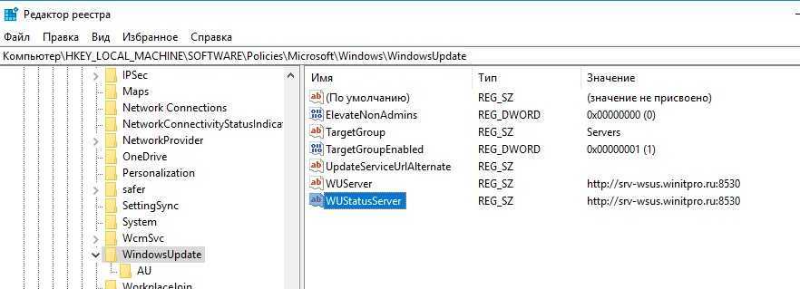 - WUServer, REG_SZ — указывает имя сервера, например, http://WSUS-SRV:8530