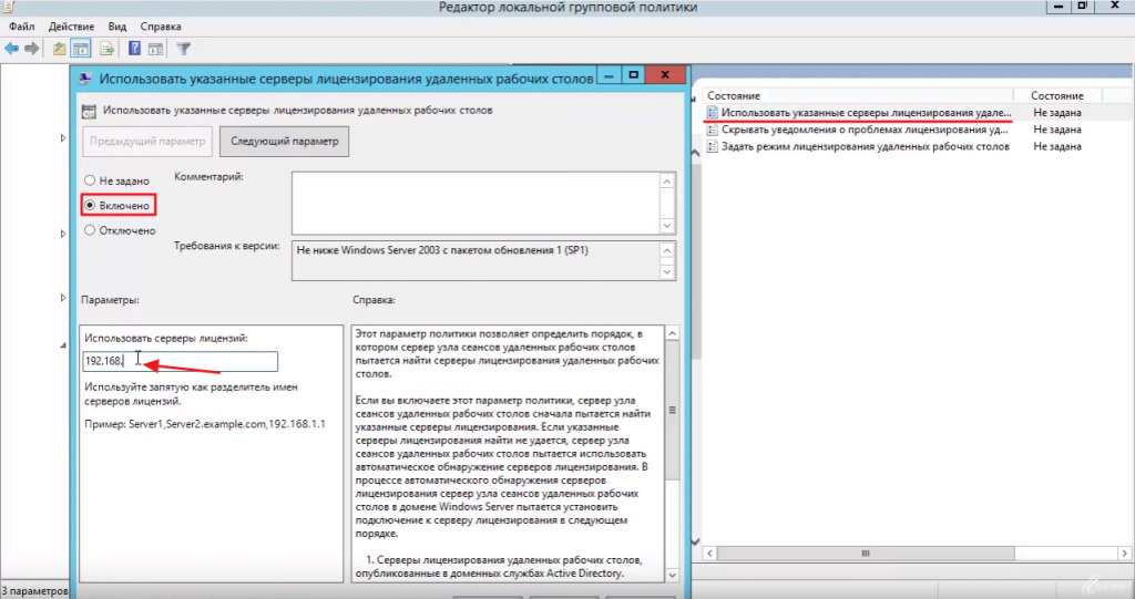 Перед вами открывается состояние лицензирования, выбираем раздел «Использовать указанные серверы лицензирования удаленных рабочих столов» затем в открывшийся вкладке ставим чекбокс на «Включено» и вписываем ip адрес сервера лицензирования в соответствующую вкладку и сохраняем изменения
