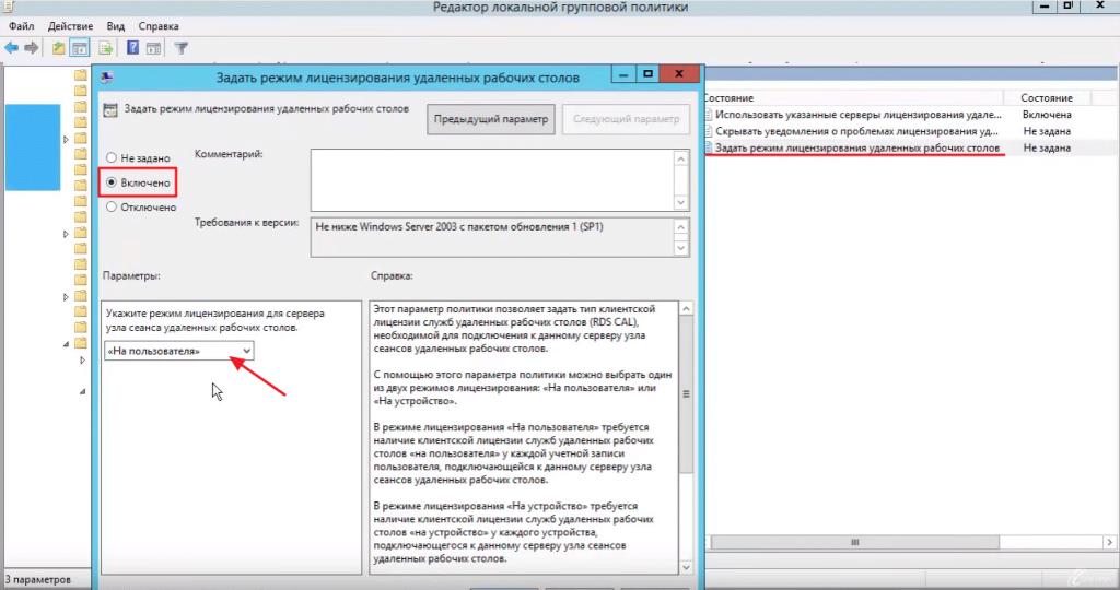 Затем следующим этапом нужно «Задать режим лицензирования удаленных рабочих столов» так же ставим чекбокс на «Включено» и выбираем режим «На пользователя» ну и собственно говоря сохраняем настройки