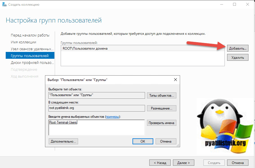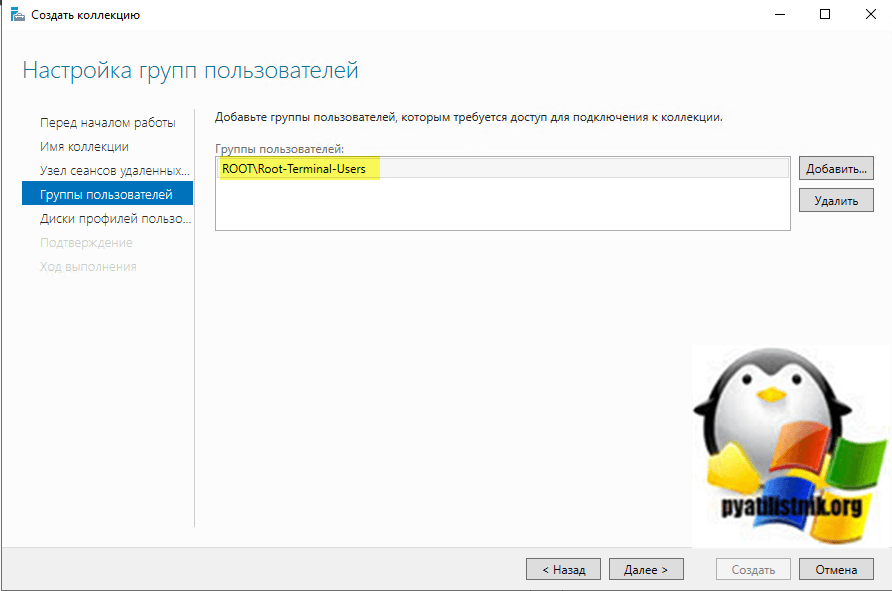 Указываем каким пользователям или группам разрешен доступ к данной терминальной ферме, я удалю группу «Пользователи домена» и добавлю другую.