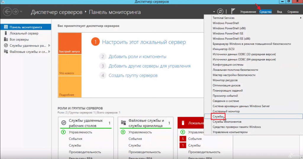 Иногда Server 2012 не видит некоторые устройства в локальной сети, для того что бы исправить данную проблему откройте «Диспетчер серверов» затем кликните по вкладке «Средства» и перейдите в пункт «Службы»