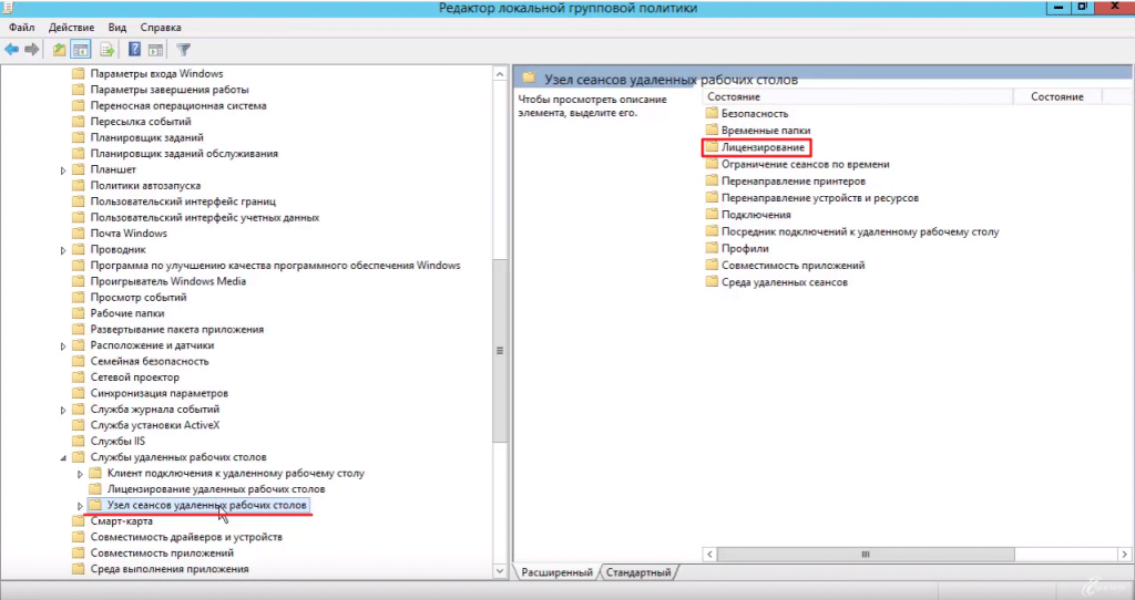 В появившимся окне ищем «Административные шаблоны» затем открываем ветку «Компоненты Windows» ищем «Службы удаленных рабочих столов» затем «Узел сеансов удаленных рабочих столов» и в правом окне находим папку «Лицензирование»