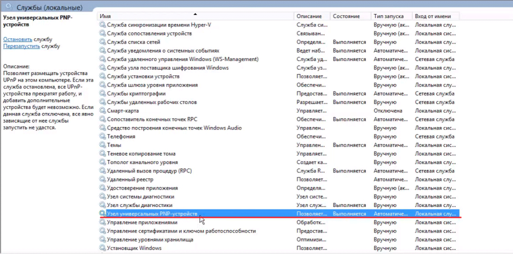 Последняя служба «Узел универсальных PNP — устройств» — данная служба так же должна выполняться