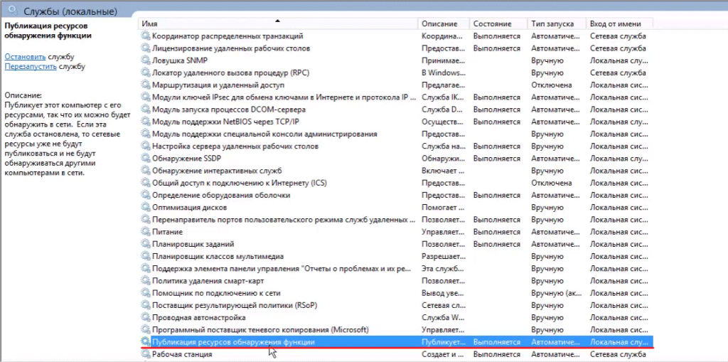 Следующая служба — это «Публикация ресурсов обнаружения функции» — так же проверяем работоспособность