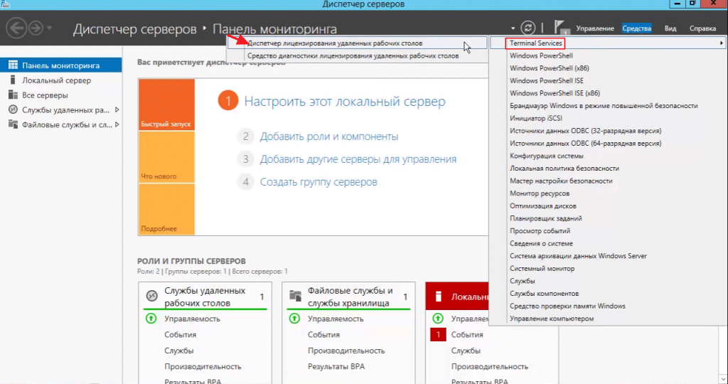 Открываем «Диспетчер серверов» затем в верхнем меню ищем вкладку «Средства» затем «Terminal Services» и в завершении «Диспетчер лицензирования удаленных рабочих столов»