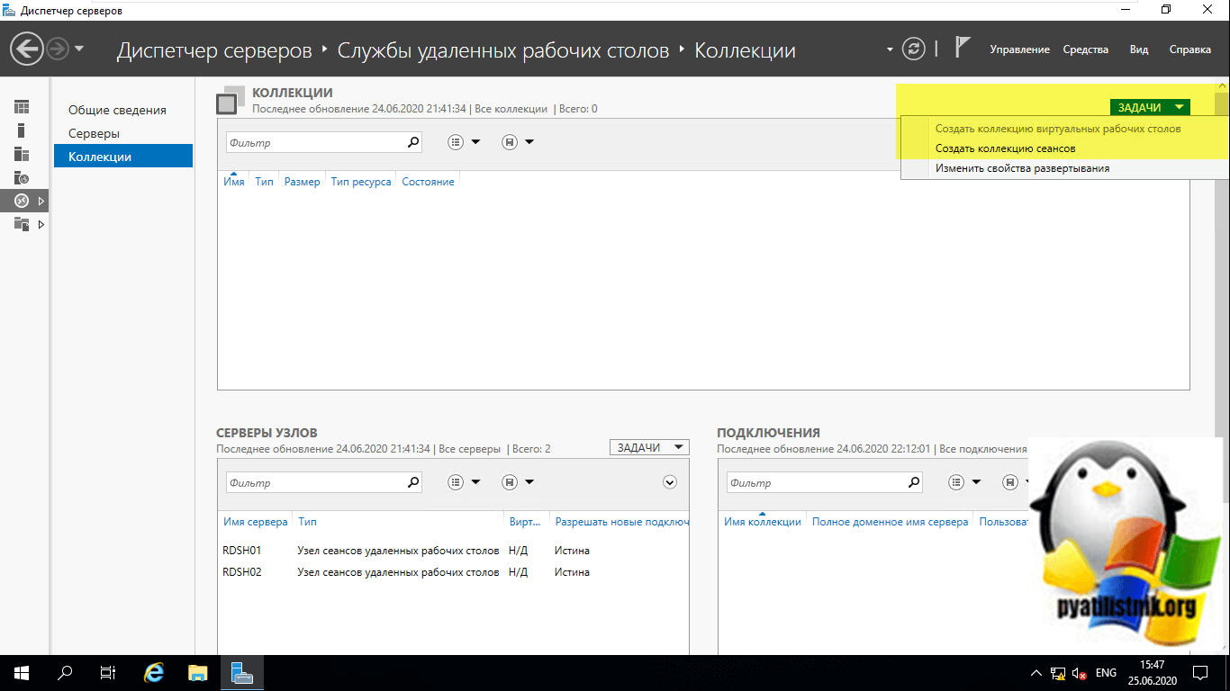 Для создания новой коллекции сеансов службы удаленных рабочих столов, выберите раздел «Коллекции» и нажмите кнопку «Задачи — Создать коллекцию сеансов»