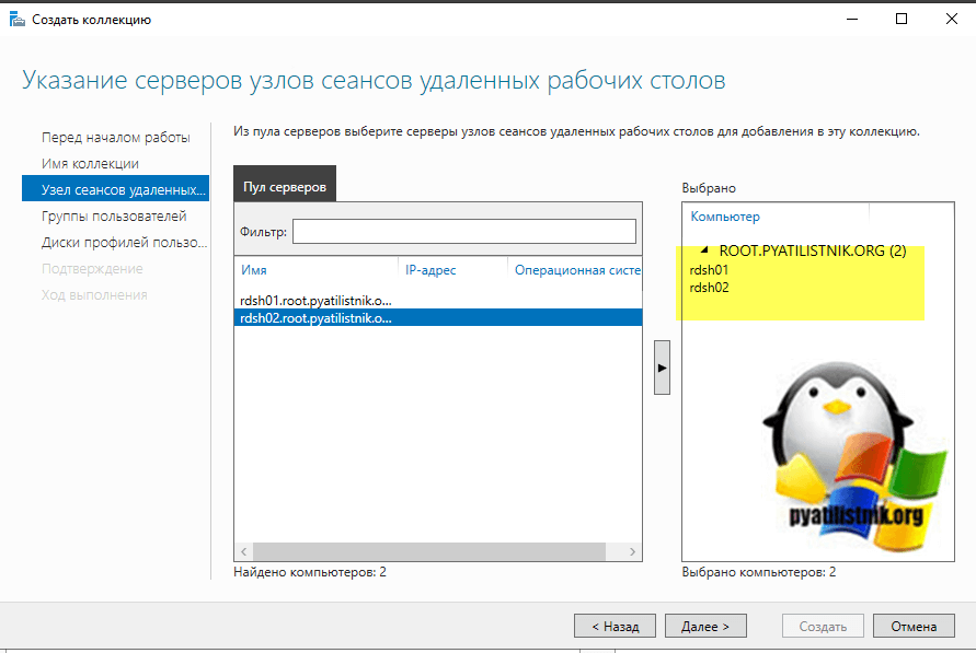 Теперь вам необходимо определиться какие серверы с ролью узлов сеансов (RDSH) вам нужно включить в коллекцию, у меня это RDSH01 и RDSH02