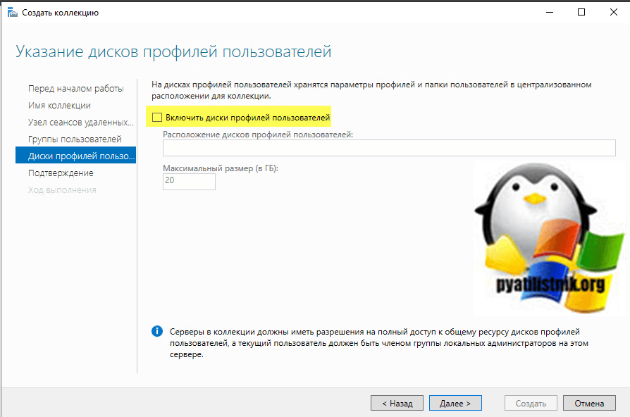 Я снимаю галку «Включить диски профилей пользователей» так как не планирую использовать UDP диски.