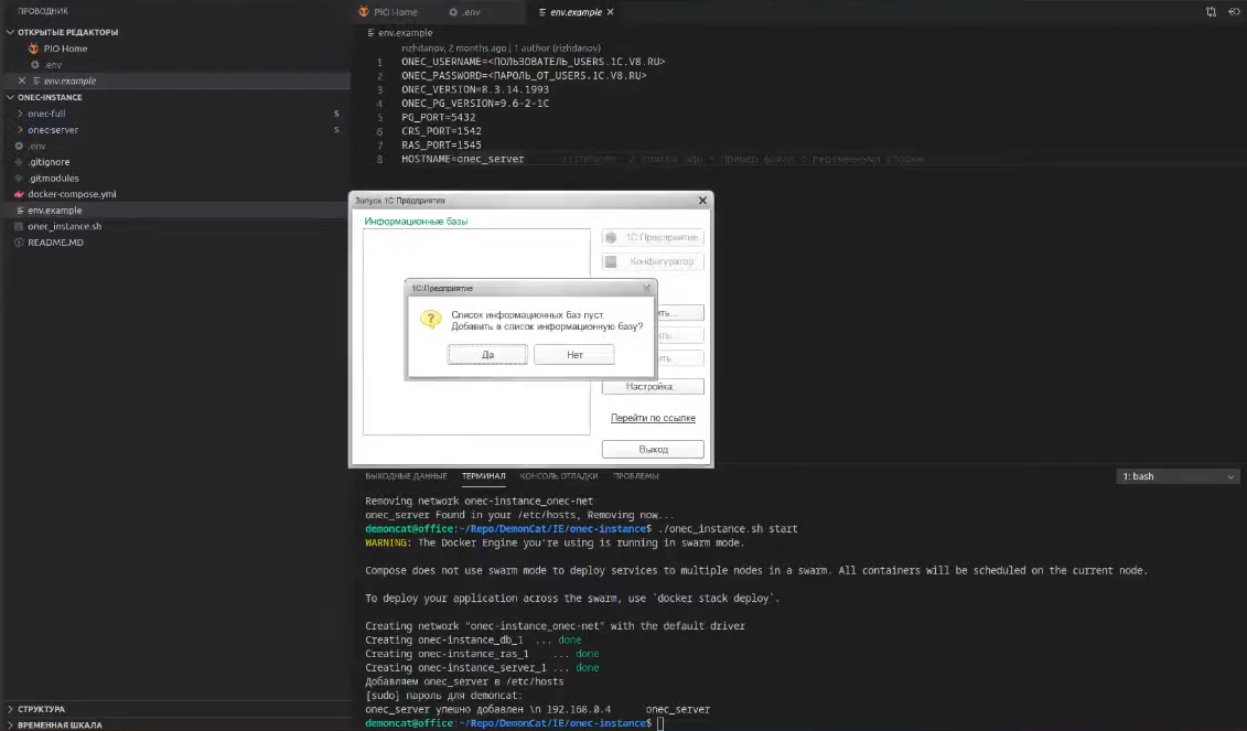 Таким образом можно разворачивать быстрые 1С-окружения. Фишка репозитория в том, что можно указать версию платформы, она выкачается и соберется в нужной версии.