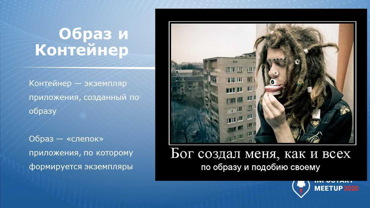 Давайте вспомним, когда мы покупали ПО на дисках. Образ – это и есть лазерный диск, слепок вашего программного обеспечения. Образ у вас один. Он может находиться у вас, в облаке, вы можете его собрать из исходников.