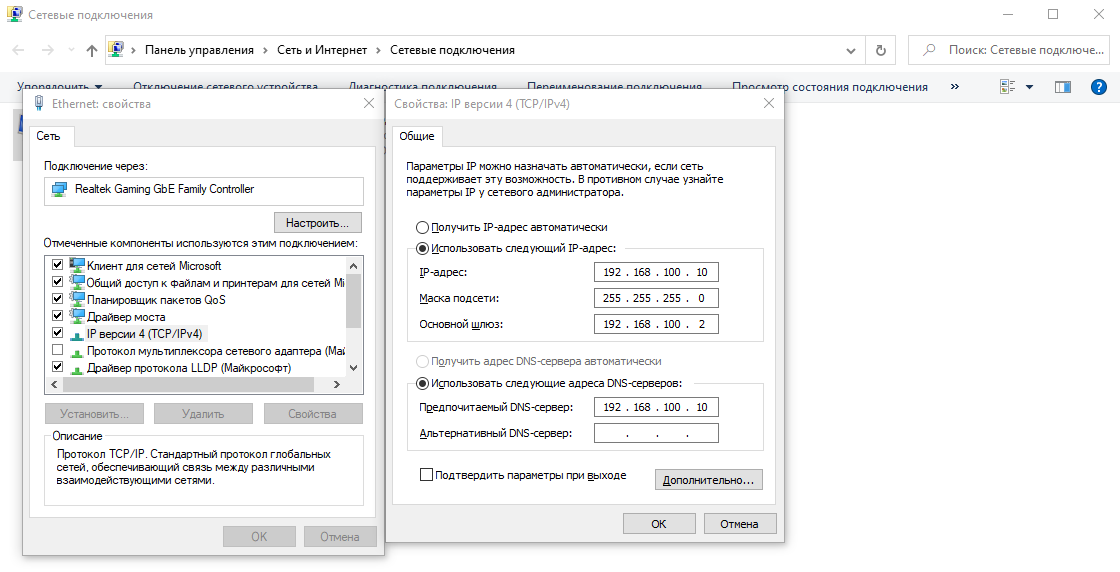Переходим в свойства используемого подключения, открываем свойства «IP версии 4». Указываем настройки своей сети. IP, маска и шлюз должны быть статичными.