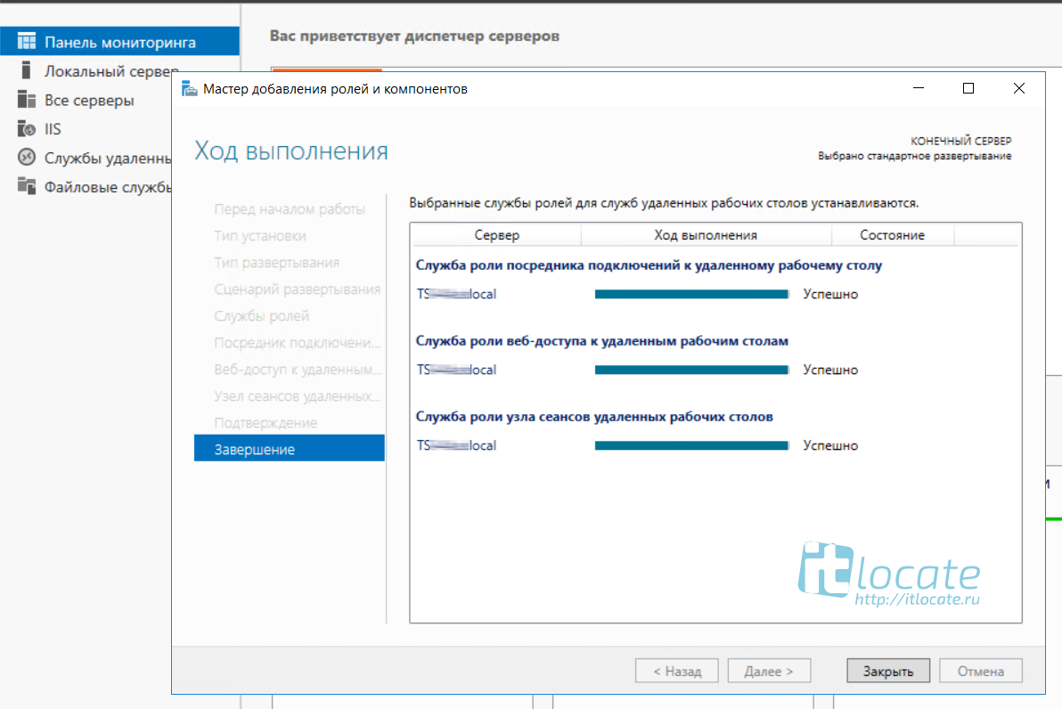Процесс развёртывания будет отображаться на экране, а по окончанию мы с вами выходим из мастера по нажатию кнопки Закрыть