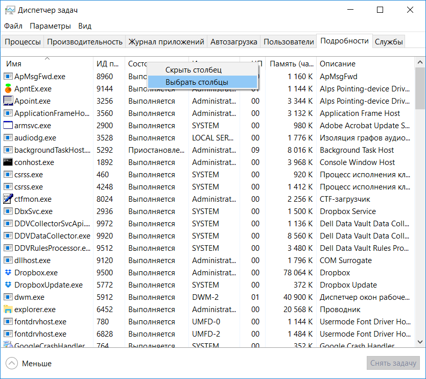 Если процессор вашего компьютера поддерживает функцию Power Throttling, соответствующий столбец с подробностями регулировки мощности отдельных процессов будет отображаться по умолчанию. Если его там нет, скорее всего процессор не поддерживает работу с Power Throttling. Быть может, что у вас современный процессор шестого поколения и выше, но вы все равно не видите нужный вам столбец. В таком случае нажмите правой кнопкой мыши по любому из заголовков столбцов и выберите Выбрать столбцы.