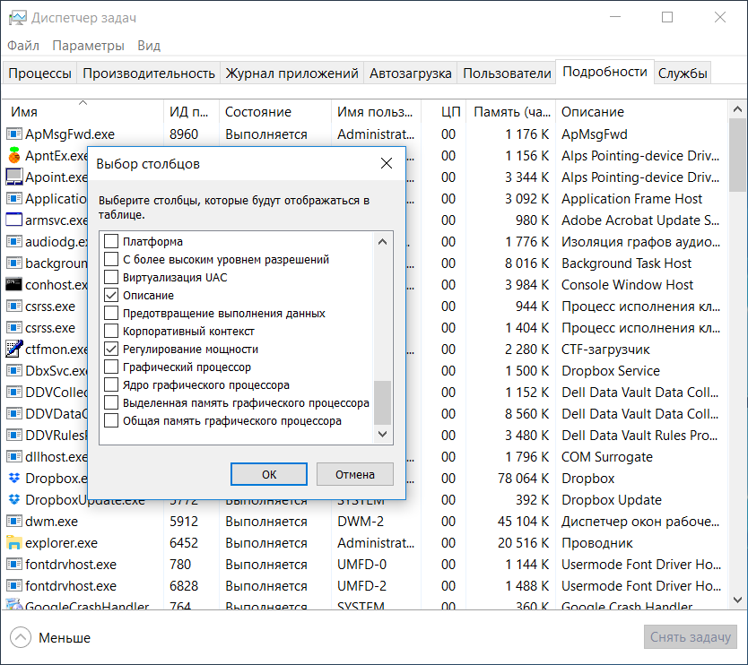 Появится небольшое окошко, в котором вам надо опуститься вниз и установить флажок возле Регулирование мощности. После этого в диспетчере задач будет отображаться дополнительный столбец, обозначающий, включена ли регулировка мощности для этого процесса или нет. На планшетах и ноутбуках часть процессов будет отображать включенное состояние регулировки мощности, а для других процессов этот режим будет отключен.