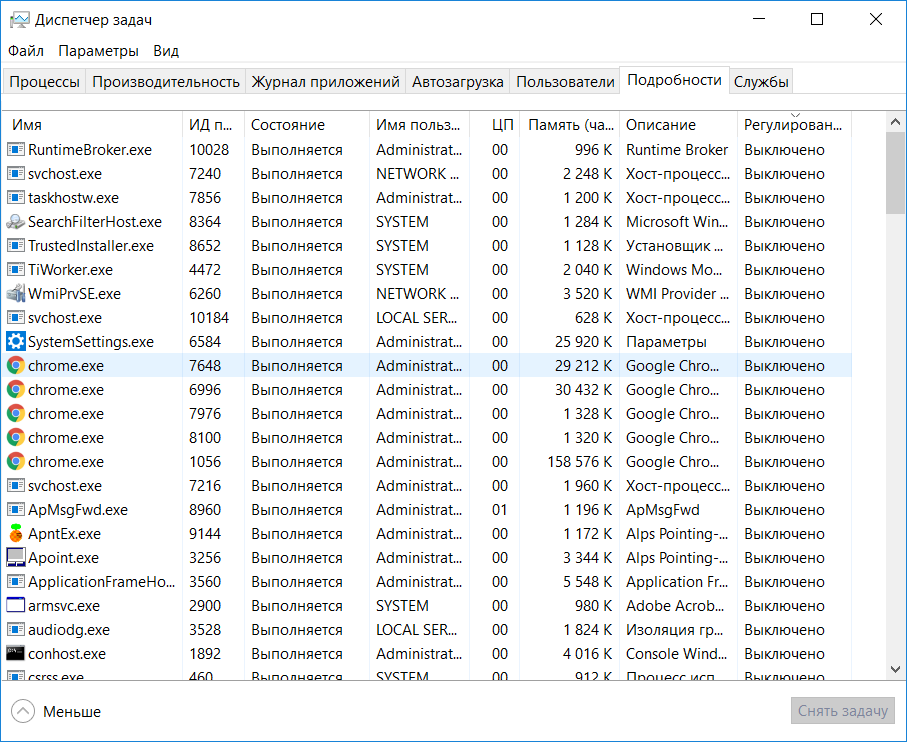 На ноутбуках, планшетах или других портативных устройствах с аккумулятором у некоторых процессов будет указан статус «Регулирование энергопотребления» – “Включено”, а у остальных – “Выключено”.
