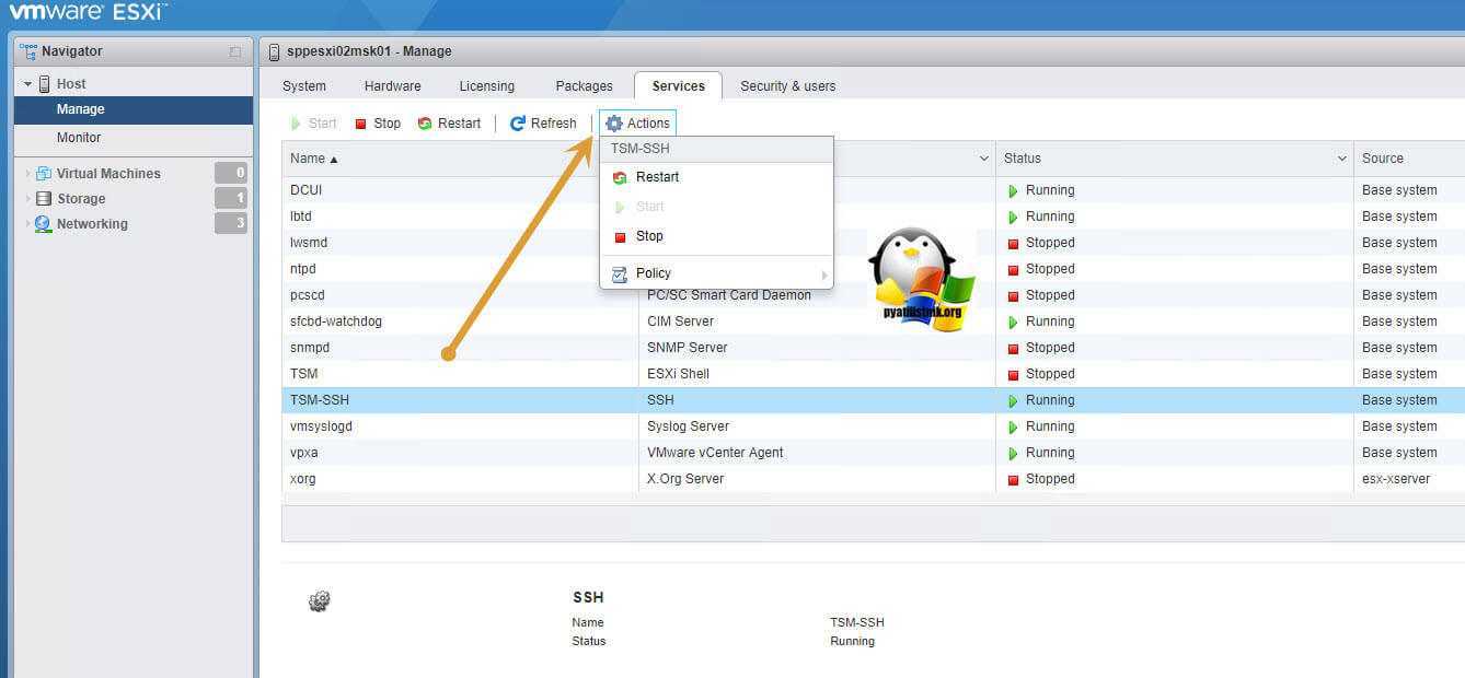 Так же обнаружил на одной из последних версий Vmware ESXI 6.5, что можно просто щелкнуть правым кликом по «Host» и выбрать пункты меню «Services — Enable Secure Sell (SSH)», удобно вынесли активацию службы SSH.