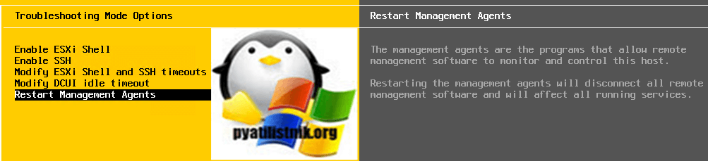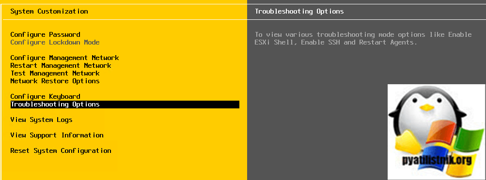 Подключившись в нему, я увидел привычный интерфейс ESXI, вам необходимо авторизоваться и пройти в раздел «Troubleshooting Options».