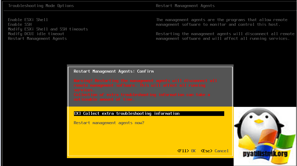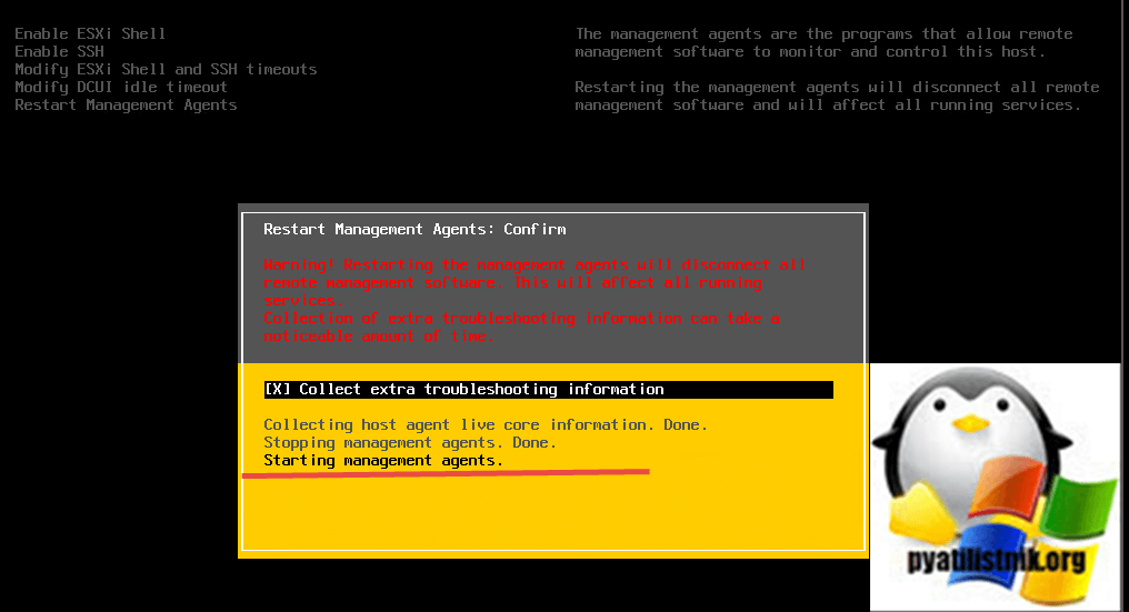 Выставите опцию «Collect extra Troubleshooting infrmation», для записи дополнительного лога ESXI, чтобы потом произвести более детальный анализ, что произошло