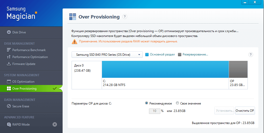 Утилиты производителей твердотельных дисков > приведу простой пример, если у вас ссд от samsung, у данного производителя есть программка Samsung Magician в которой вы можете в пункте System management > over provisioning задать нужный процент, в данном примере это 10 процентов, ниже мы рассмотрим как этот процент влияет на производительность ssd