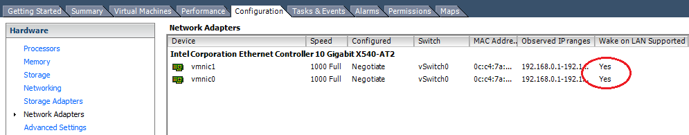 Для работы Wake-On-Lan необходимо выделить vMotion в отдельную IP-сеть и использовать гипервизоры ESX(i) 3.5, или выше. Каждый интерфейс сети vMotion должен поддерживать Wake-On-Lan. Проверить, поддерживают ли сетевые интерфейсы хоста Wake-on-LAN можно перейдя в vSphere Client к настройкам хоста: