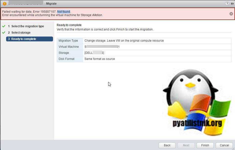 Failed waiting for data. Error 195887107. Error encountered while unstunning the virtual machine for Storage vMotion